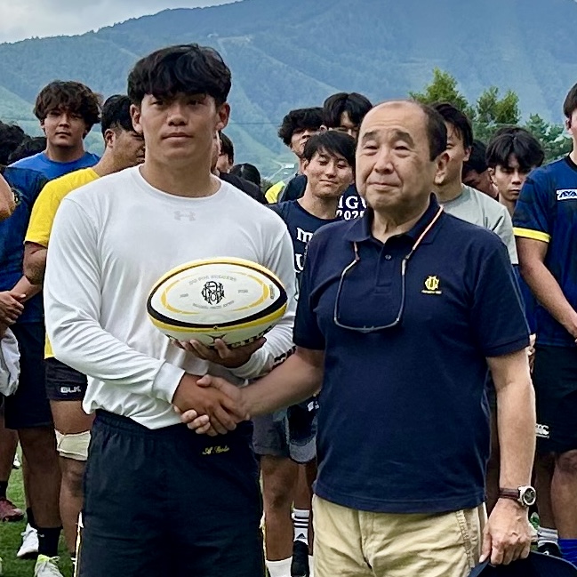 去る2025年8月16日、長野県・菅平高原で行われた夏合宿において、約20名のOB・OGが集まる中、当法人倶楽部監事原田氏より創部100周年を記念した特製ロゴ入りボール30個が贈呈されました。